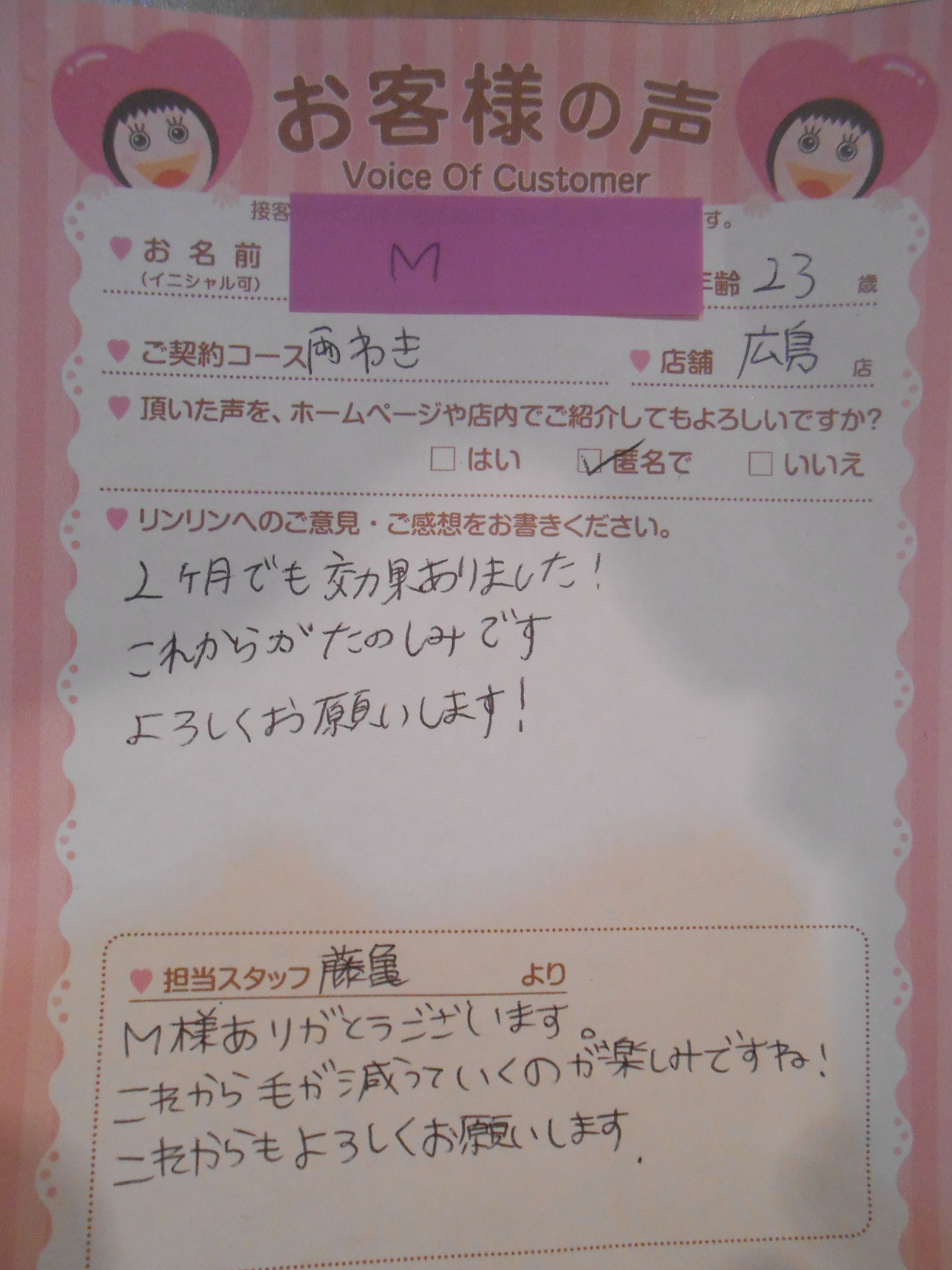 いつもご来店ありがとうございます(*^_^*) たまに処理する時はシェーバーにして下さいね♪ お友達と脱毛の事話してみて下さい♪