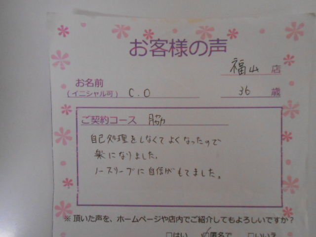 脱毛の効果が現れて大満足しています。ありがとうございます。あと二年ありますがよろしくお願いします。