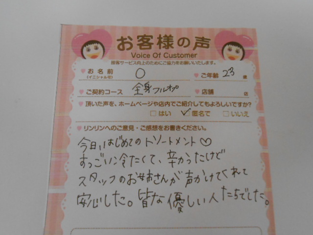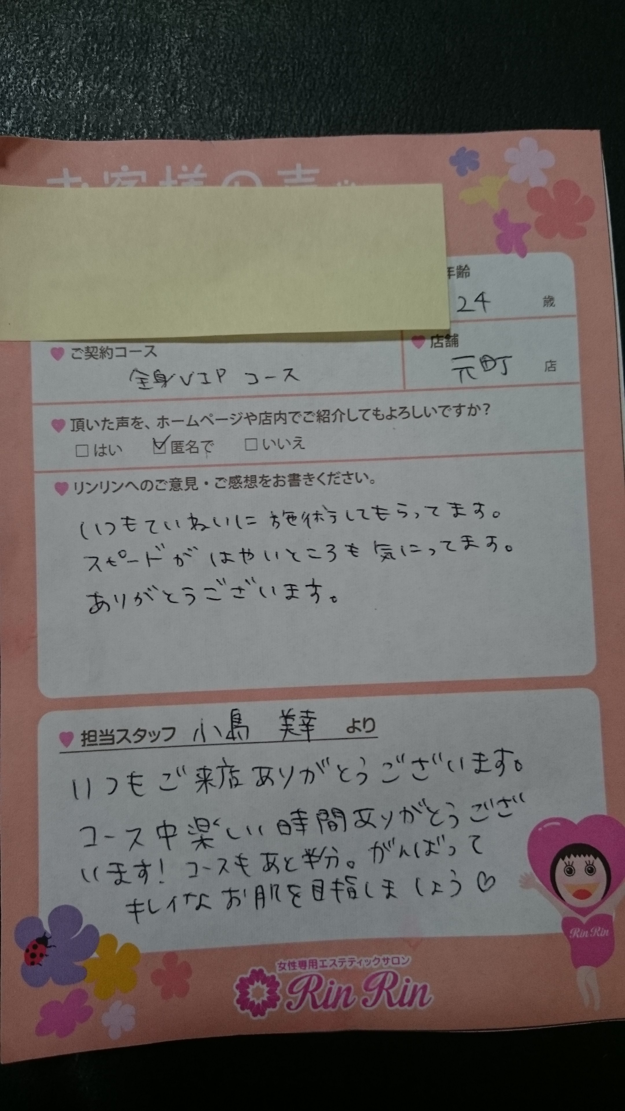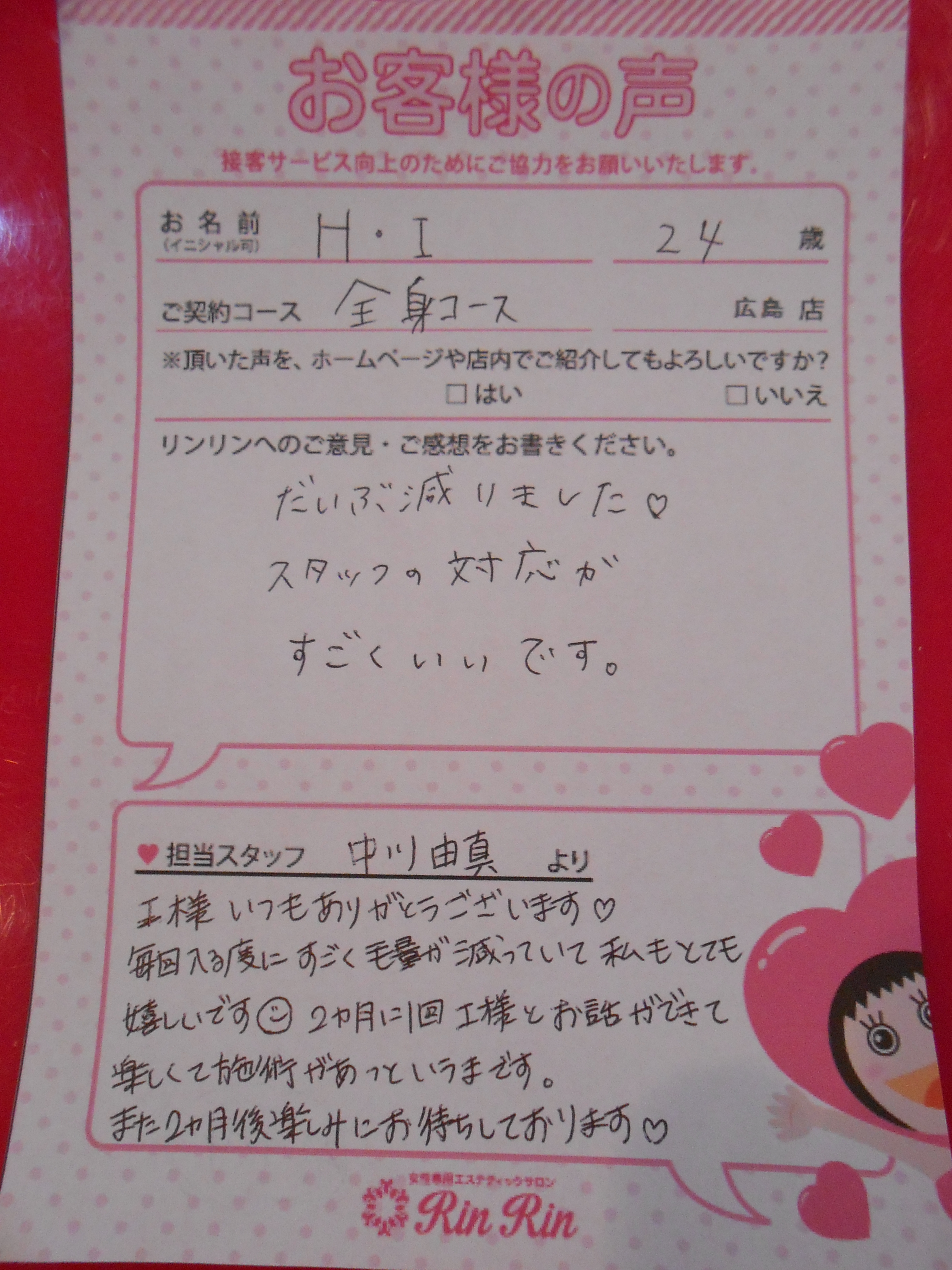 AINA様 本日1回目とあり緊張されたんではないでしょうか? 熱さや痛みはなかったでしょうか? 私もリンリンの安さには驚きました(笑) これから回数を重ねて頂いて、来年の夏には自己処理が減っているといいですね! 次回もお気をつけてお越しくださいませ。