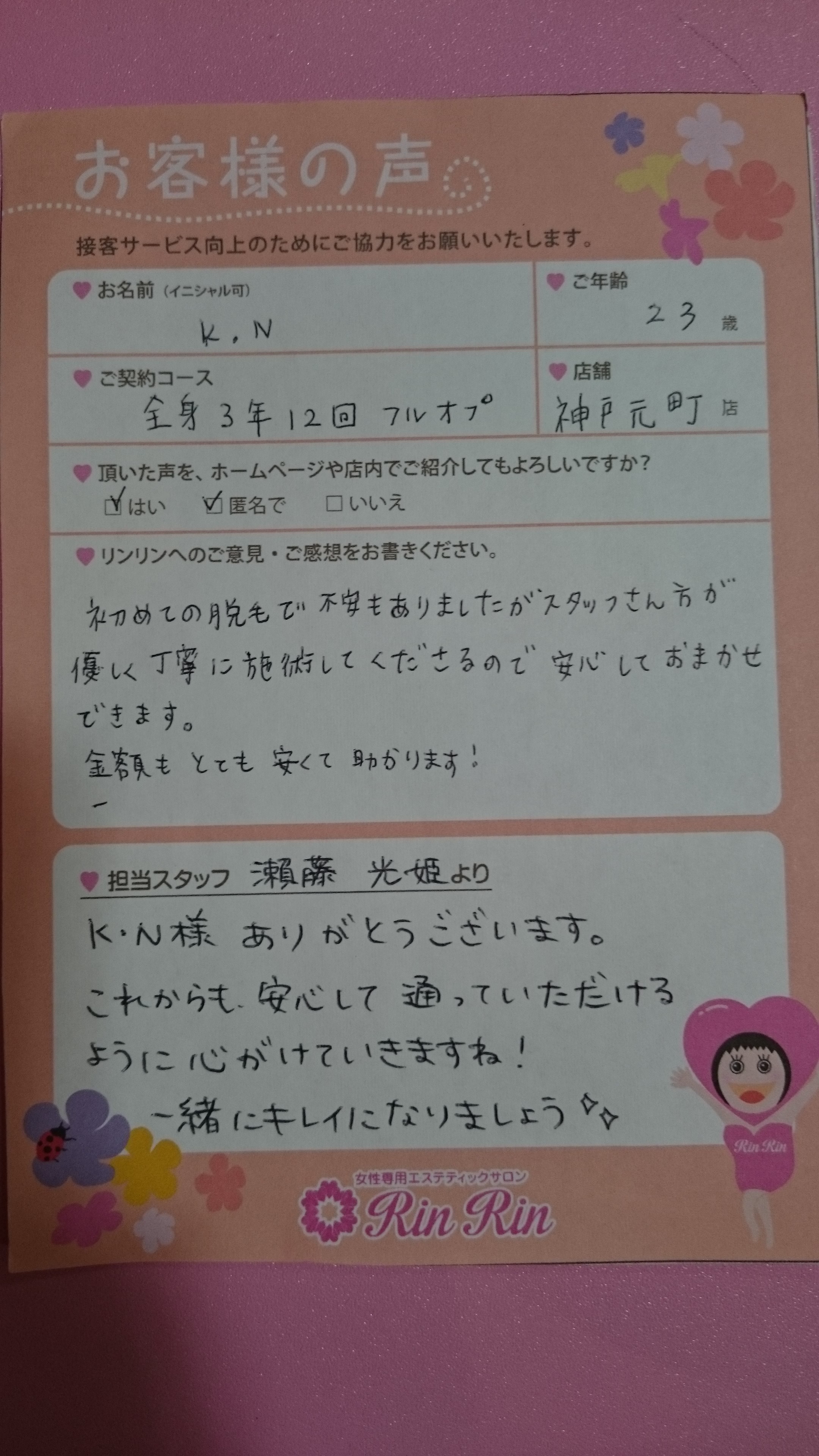 K・N様ありがとうございます。 これからも安心して通っていただける ように心がけていきますね! 一緒にキレイになるましょう!