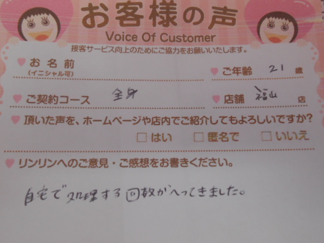 M様。本日もご来店ありがとうございます。 自己処理が随分楽になってきたという事で、私たちも嬉しいです! これから、もっと減っていきますので、アイスノンは冷たいですが、がんばって通って下さいね☆