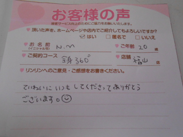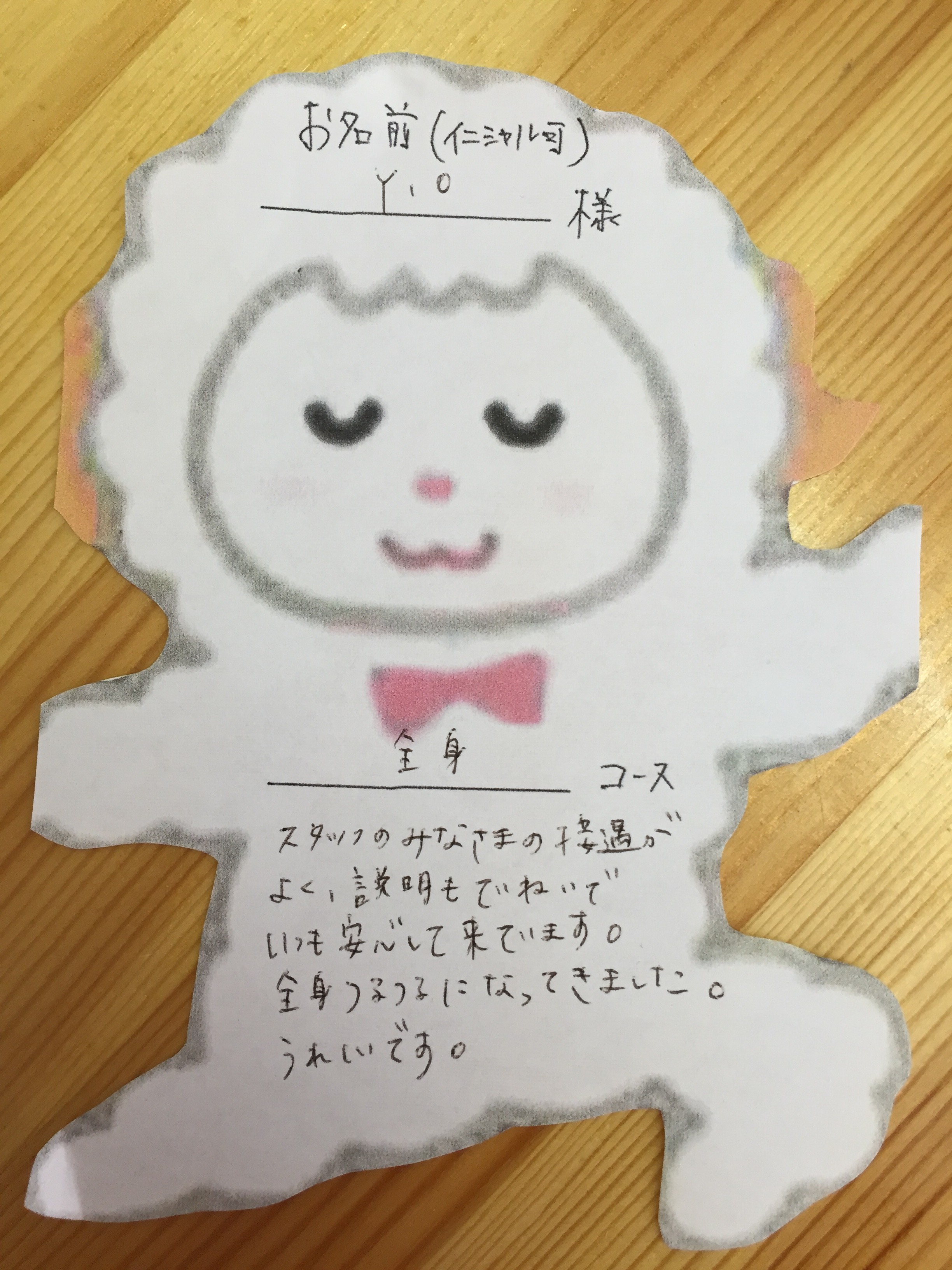いつも、ていねいな接客で気持ちよく施術を受けることができています。施術箇所の相談にも、親切に対応してもらいました。これからもよろしくお願いします。