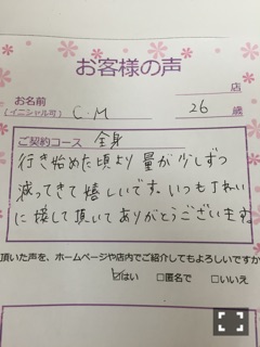 S様 いつもご来店ありがとうございます。 効果も実感して頂けているようで私も嬉しいです。 これからもスタッフ一同精一杯サポートさせて頂きますね! 今、お得なキャンペーンもしてますので、またお考え下さい。