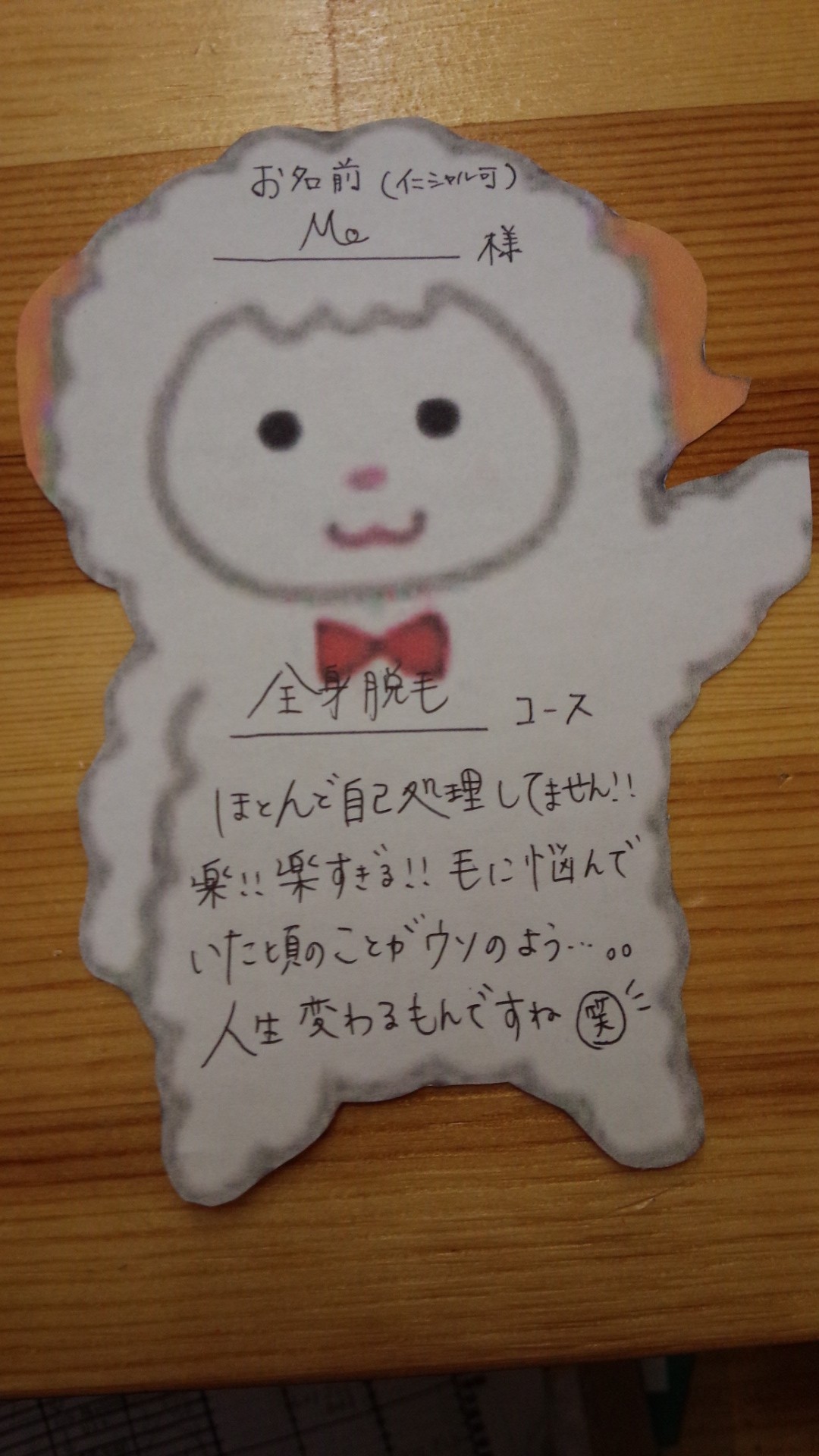 A.Nさまいつもご来店ありがとうございます❤今月から産休育休に入るので1年半くらい会えなくなってしまうのが寂しいです(;_;)コメントに頂きましたが私もいつも楽しい時間です!また戻ってきた時はよろしくお願いします!今よりもっと毛が薄くなっていることも楽しみにしています☆