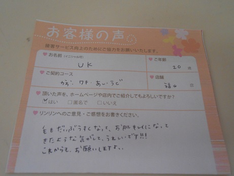 本日もお忙しい中、ご来店頂きまして 誠にありがとうございます。 初めの頃に比べて、だいぶ毛も薄くなってお肌も 以前よりいっそう艶がでてきましたね。これからの美肌作りのお手伝いを頑張ってしていきますね!