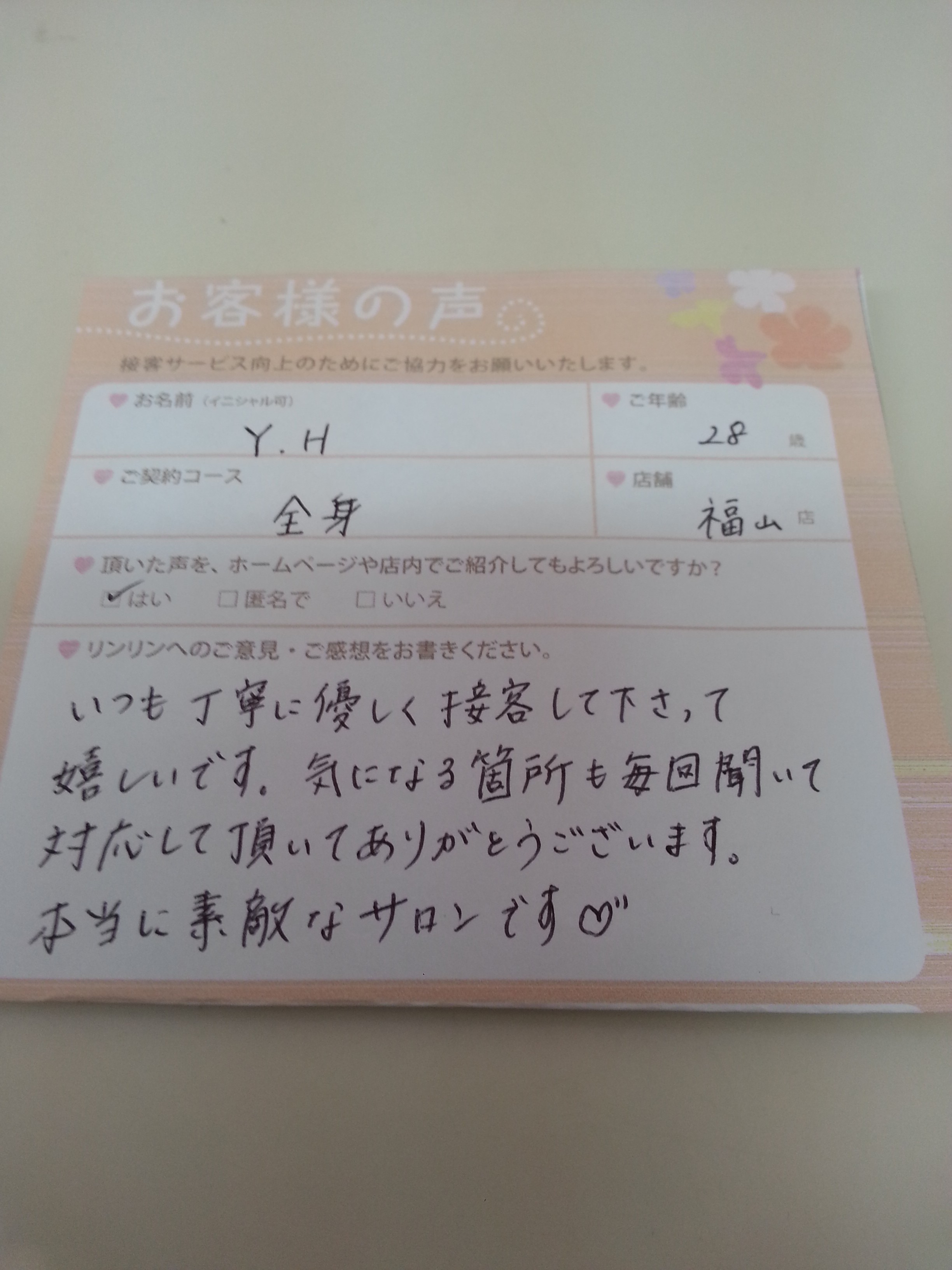 いつもありがとうございます。 お手入れに入るスタッフの人数、今後、気をつけます。 これからも、リラックスして楽しくお手入れを受けて頂けるよう、頑張ります。