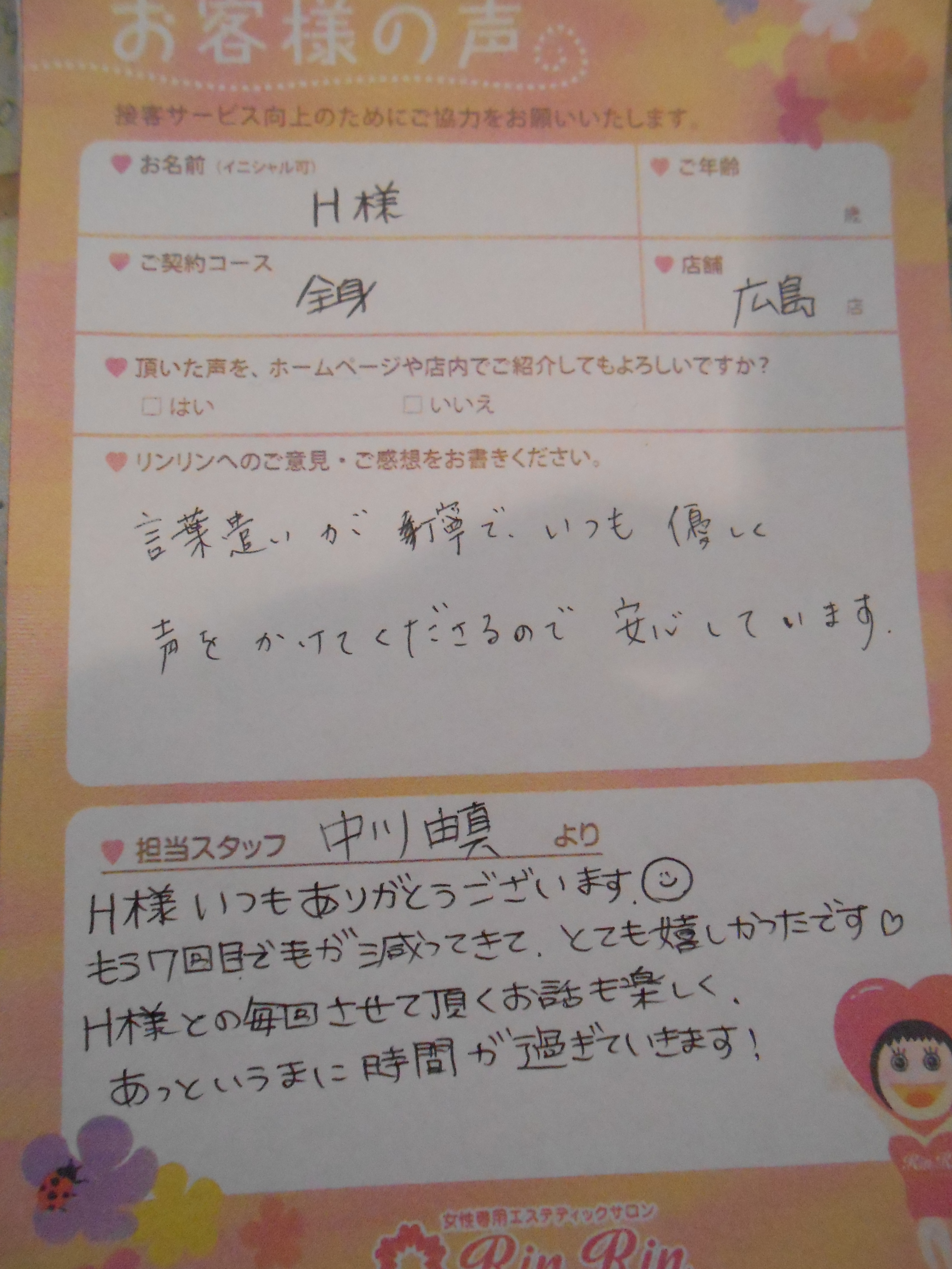 初めての脱毛でドキドキしますよね!!安心していただいていてこちらもすごく嬉しいです。これからも安心して通っていただけるように頑張りますのでよろしくお願い致します。