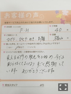 F、H様いつもありがとうございます。毛の減りもご満足いただけ桑原も嬉しいです。 次回もよろしくお願い致します。