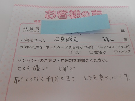 私はまだ16歳で、母と「まだ早いかな?」と迷っていたのですが、やってみて正解でした!!リンリンは他の店よりも対応が丁寧で安心して任せられるし、毛が抜けてきているという実感も強かったです。毛が濃く悩みの種だったのが、毛が薄く人に見られても恥ずかしくないという自信につながり、とっても幸せです。