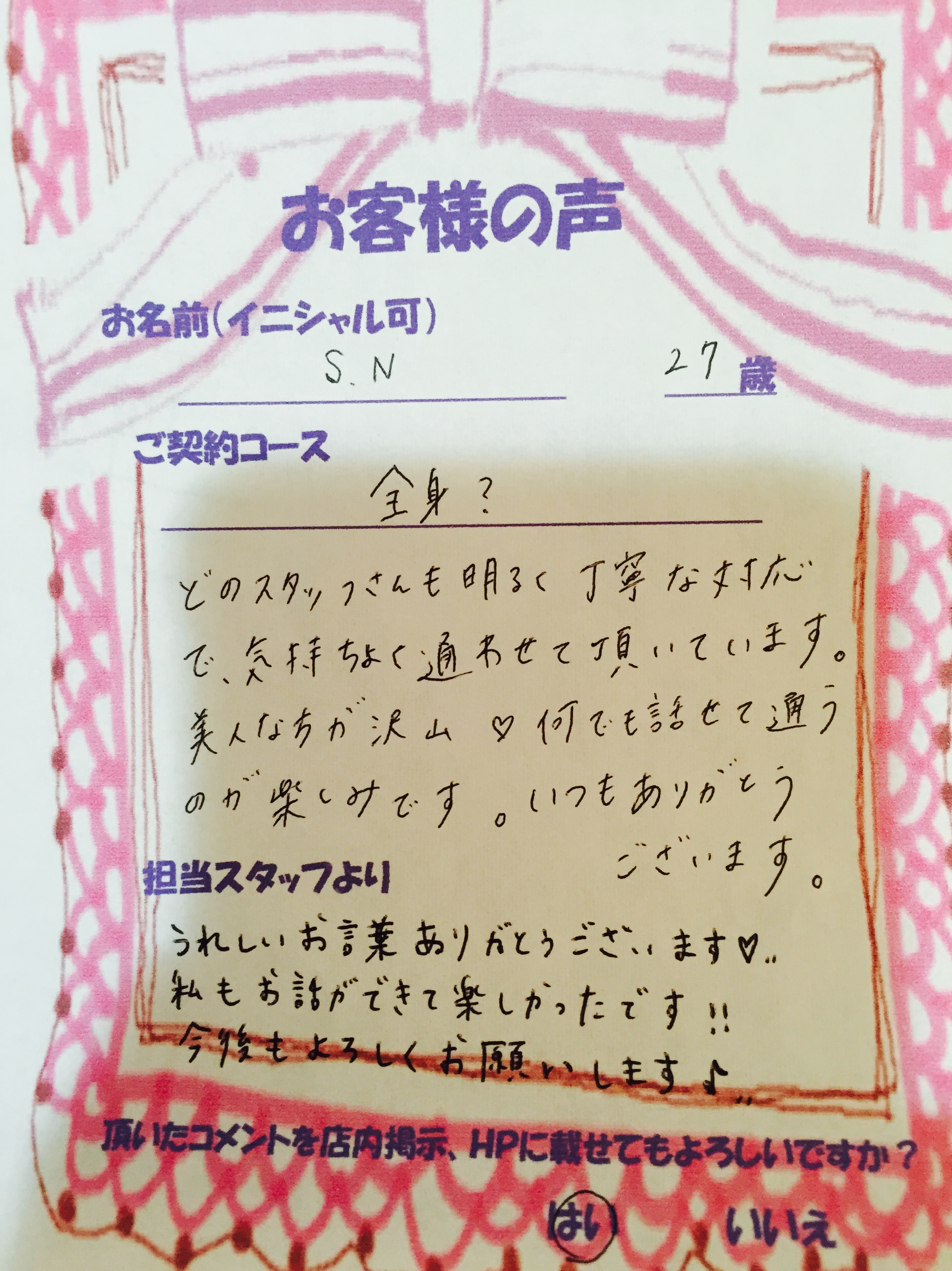 スタッフのみなさんがとてもていねいに接して下さり、お話しがとても楽しくケアの事も勉強になります。脱毛も1年少したちますが成果が出て3年コースやって良かったと思っています。1回やるたびに目に見えて肌がきれいになっていくのがとてもうれしいです。