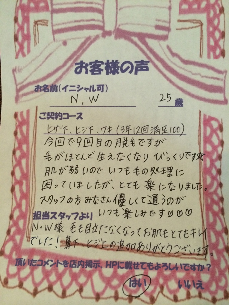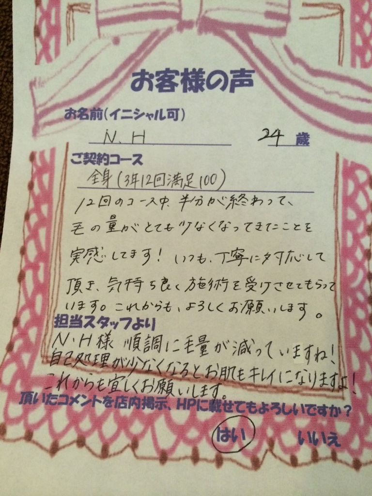 M.A様 いつも遠い所、ご来店ありがとうございます。 私も小さい頃、毛深いのがすごく悩みでした。 回数を重ねて頂いて自己処理が減るといいですね。 私もM.A様のこれからの効果が楽しみです。 これからもスタッフ一同精一杯サポートさせて頂きますのでよろしくお願い致します。
