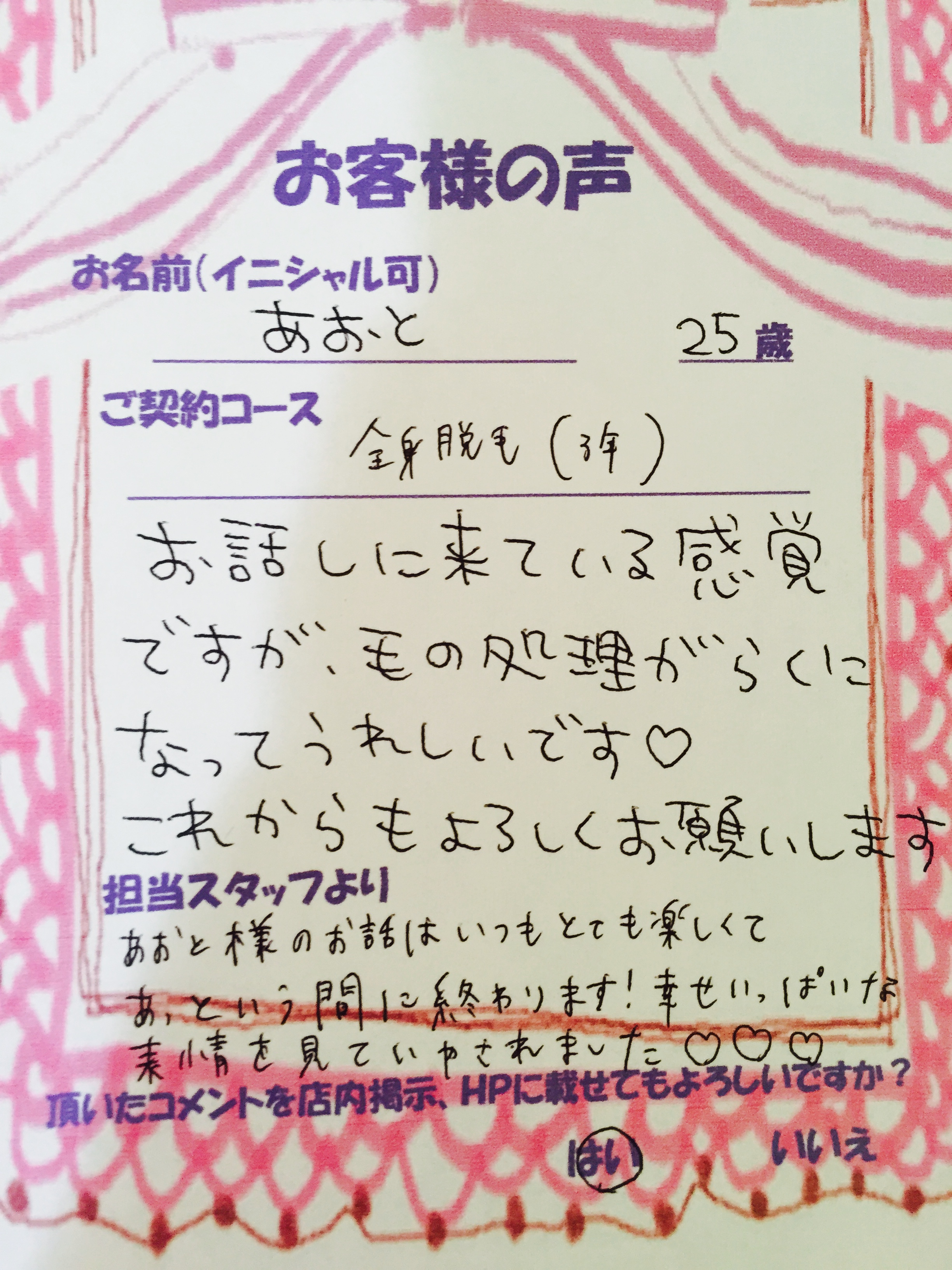 いつもお綺麗で毎回お会い出来るのを楽しみにしてます(´∀`)2人の娘さんもご紹介下さり感謝しております♥毛もほとんど無くなり、お肌もツルツルで完璧です!!