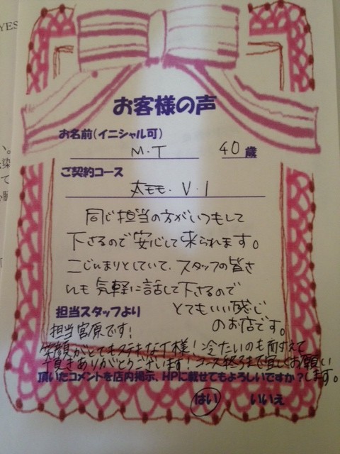 いつもいろいろお話してくれて楽しく脱毛受けてます。ありがとうございます!