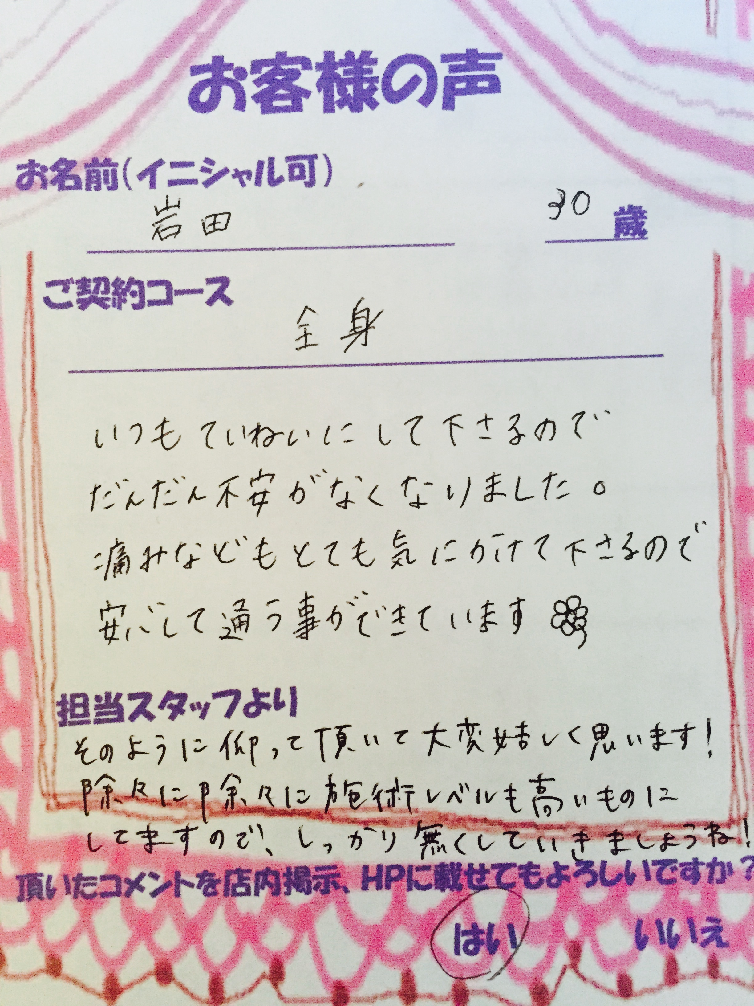 ご来店誠にありがとうございました。 効果がでて良かったです(*^_^*) 残りの回数もしっかり当てていきましょう☆ミ